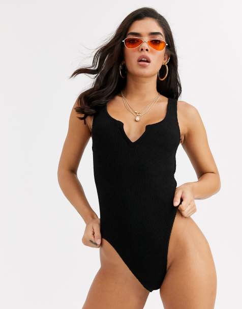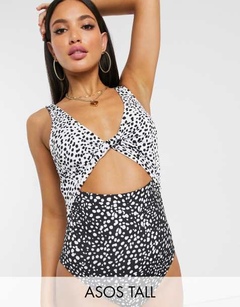 Asos swim swimwear one piece black mesh tie back halter triangle sz 10. Choose a matching set or express your individuality with our mix and match options. Stand out from the crowd on the sand or poolside with patterned swimming costumes by missguided or bag a sporty classic from nike.