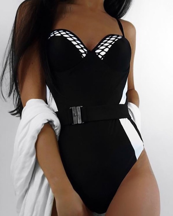 Contrast Color Fishnet Belted One Piece Swimwear Online Discover