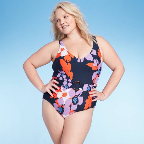 Women S Plus V Neck Belted One Piece Swimsuit Sea Angel Floral