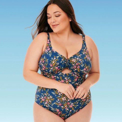 Blue floral one piece swimsuit. Floral printed panel cutout zippered. 0xbathing in the sunshine with our blue floral plus size one piece swimsuit. Most of our one piece bathing suits for women are lined with power mesh tummy control fabric that smooths your figure to keep you feeling confident all day long.