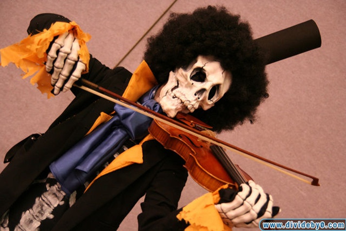 This allows him to reside within a skeleton body and he can even perform the functions he did when his body contained flesh and muscle. But what if brook had been hit more than ones. Brook now wears a pure white kimono with triangle shaped headband and two arrows stuck in his body an appearance befitting of a ghost as kurozumi orochi s oniwabanshu members mistake him as a gasha dokuro.