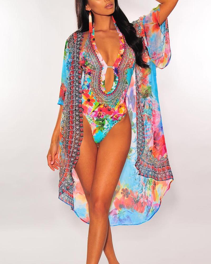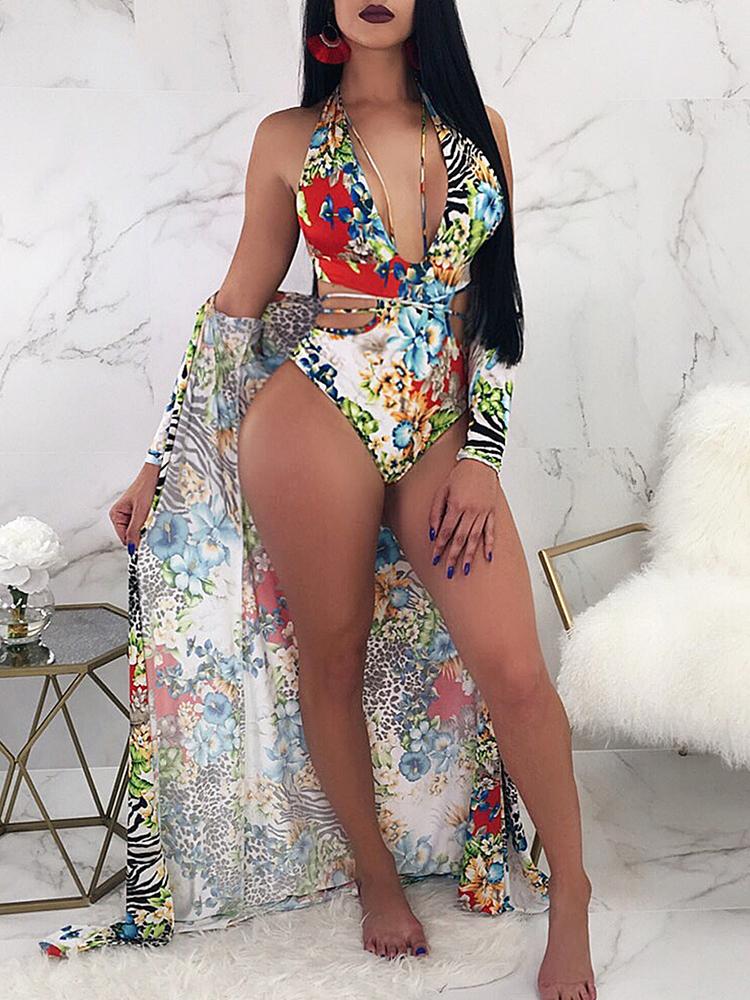 Floral Print Strappy One Piece With Cover Up Sets