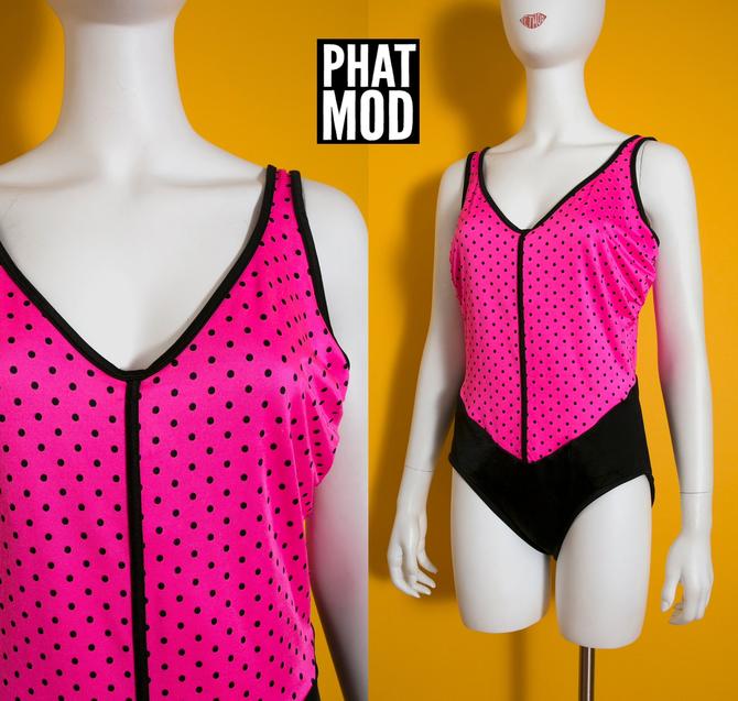 Fun Bright Vintage 80s 90s Neon Pink And Black Polkadot One