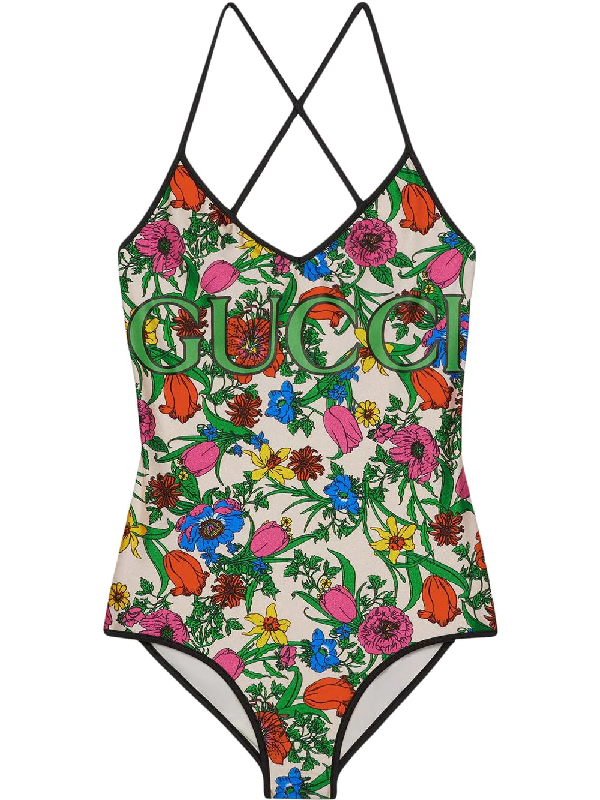 Gucci Pop Flora Print One Piece Swimsuit In Green Modesens