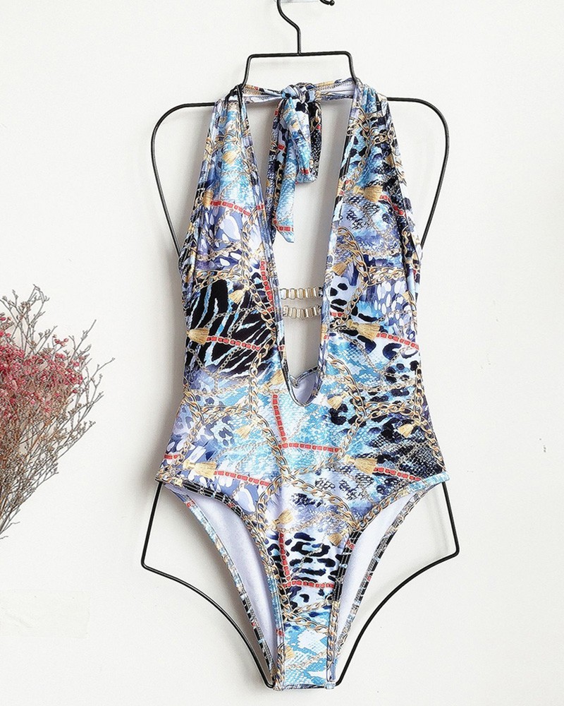 Halter Plunge Colorblock Chain Print Backless One Piece Swimsuit
