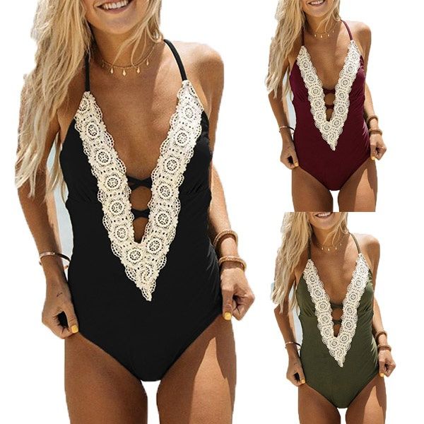 Women S Lace Crochet Plunging Neckline Open Back One Piece Bathing