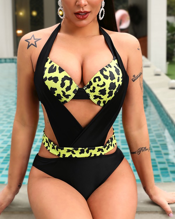 Sexy Leopard Print Halter Neck Cut Out One Piece Swimwear