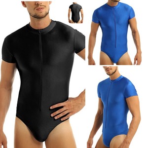 Mens Front Zipper Gymnastics High Cut Leotard Bodysuit Swimwear