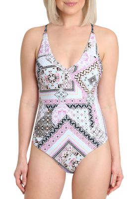 South of the border embroidered styles feature colorful embroidery like the beautiful huipl blouses of these countries and cuban influences also contribute to nanette lepore swimwear s brilliant zesty styles. Soak up the sun in the nanette lepore bloomin botanical goddess one piece swimsuit. Technicolor tropical vixen top.