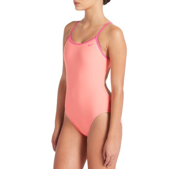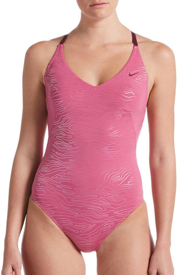 Nike pink one piece swimsuit. Nike women s solid cut out back one piece swimsuit. Free delivery and returns. Mesh insets help with water drainage as well as maximizing breathability.