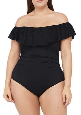 Women s plus size off the shoulder one piece swimsuit. A ruffled statement neckline and figure perfecting shirring are so pretty and alluring without showing extra skin. The best of both worlds this one piece shows some skin while also feeling streamlined.