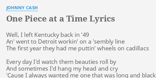 One piece at a time song. Chorus i d get it one piece at a timeand it wouldn t cost me a dimeyou ll know it s me when i come through your towni m gonna ride around in stylei m gonna drive everybody wild cause i ll have the only one there is a round. Although primarily remembered as a country music icon his genre spanning songs and sound embraced rock and roll rockabilly blues folk and gospel. Cash was known for his deep calm bass baritone voice the distinctive sound of his.