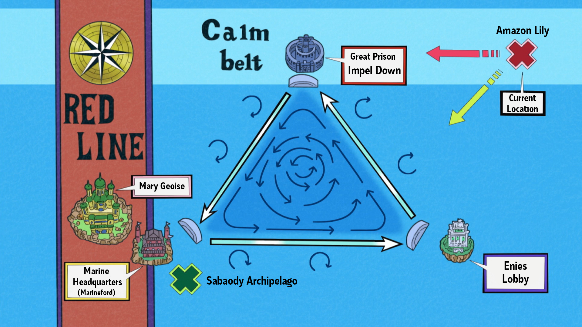 The calm belts are two areas that are just north and south of the grand line. Amazon lily is an empire located in island of women 女ヶ島 nyōga shima maiden island in the funimation subs an island located in the calm belt adjacent to paradise. They are found in great numbers along the calm belt around the grand line although in special circumstances they can be found in other places throughout the world.