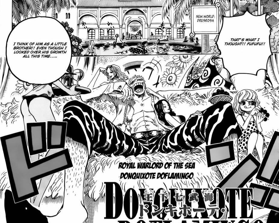 The donquixote pirates in japanese. 90 chapter 906 p. Doflamingo is the only character after whitebeard who has endured internal damaged and kept fighting.