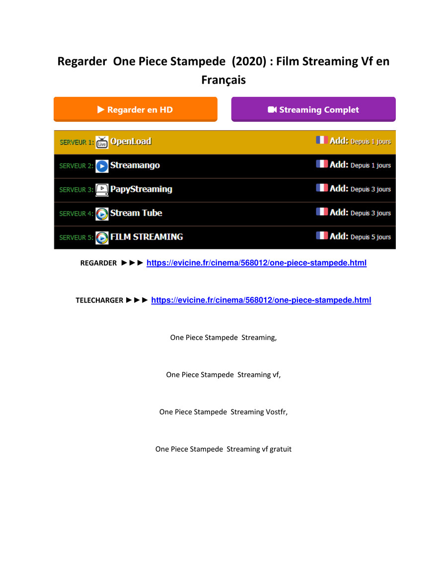 Luffy et de ses compagnons de route. Keywords one piece stampede film complet one piece stampede film streaming one piece stampede streaming regarder one piece stampede vf hd voir film one piece stampede. Il a déclaré que netflix continue ses dvd serone piece stampedes avec 5 3 millions d abonnés ce qui représente une baisse importante par rapport à l année précédente.