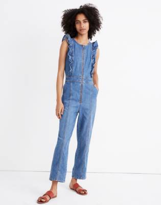 Denim Ruffle Sleeve Zip Front Jumpsuit