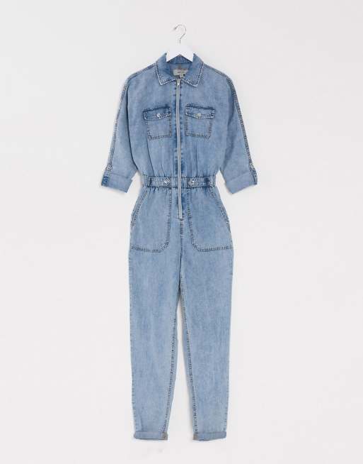 New Look Tall Zip Front Denim Jumpsuit In Mid Blue Asos