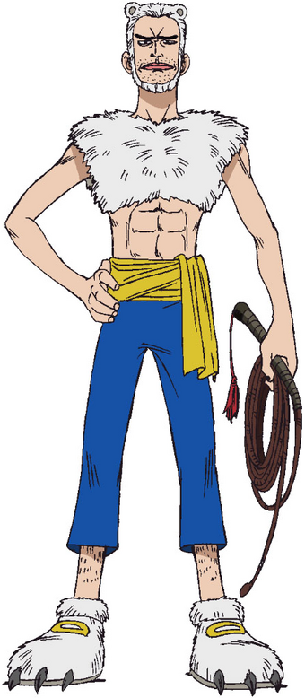 He burned down a pet shop in orange town. He has yet to prove it in the series outside of his pet a lion named richie who is more like another crew member than just a pet. He wears a white fur vest that covers the area of his chest green pants blue in the anime held up by a black sash yellow in the anime and shoes in the shape of animal white fur feet.