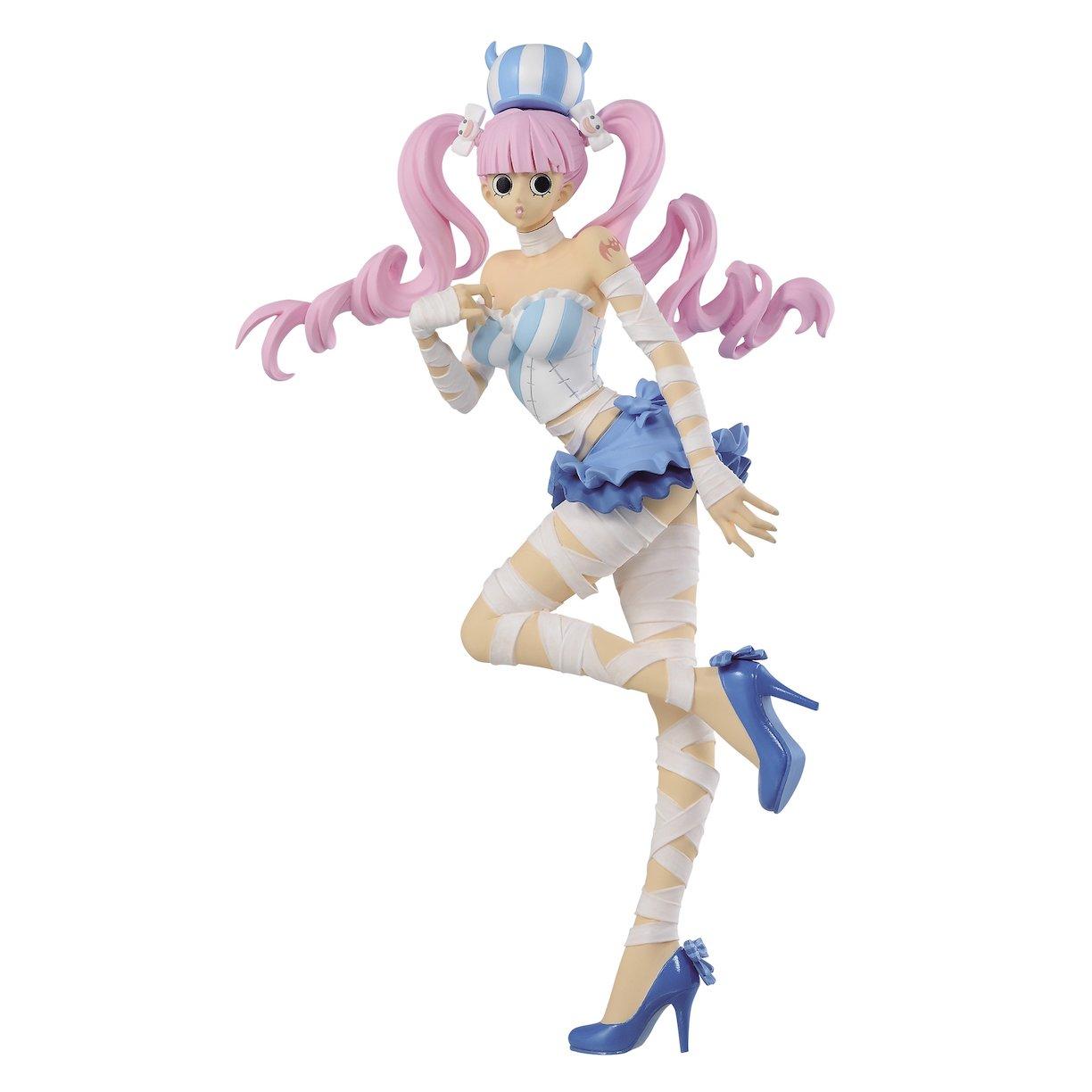After the two years timeskip perona has a more mature look than before wearing a long black strapless dress with lavender frills red high heeled boots and a big black top hat with white floral decor. Banpresto 16100 one piece sweet style pirates perona ver. Perona is a short young woman with unusually big round eyes and she has long light pink hair that she keeps tied into two pigtails with black and white flower hairpins.