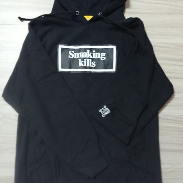 One piece x fr2 smoking kills hoodie adjustable drawstring hood printed smoking kills on front and sleeves printed graphic on back kangaroo pocket co branding patch above left cuff ribbed cuffs and hem 100 cotton.