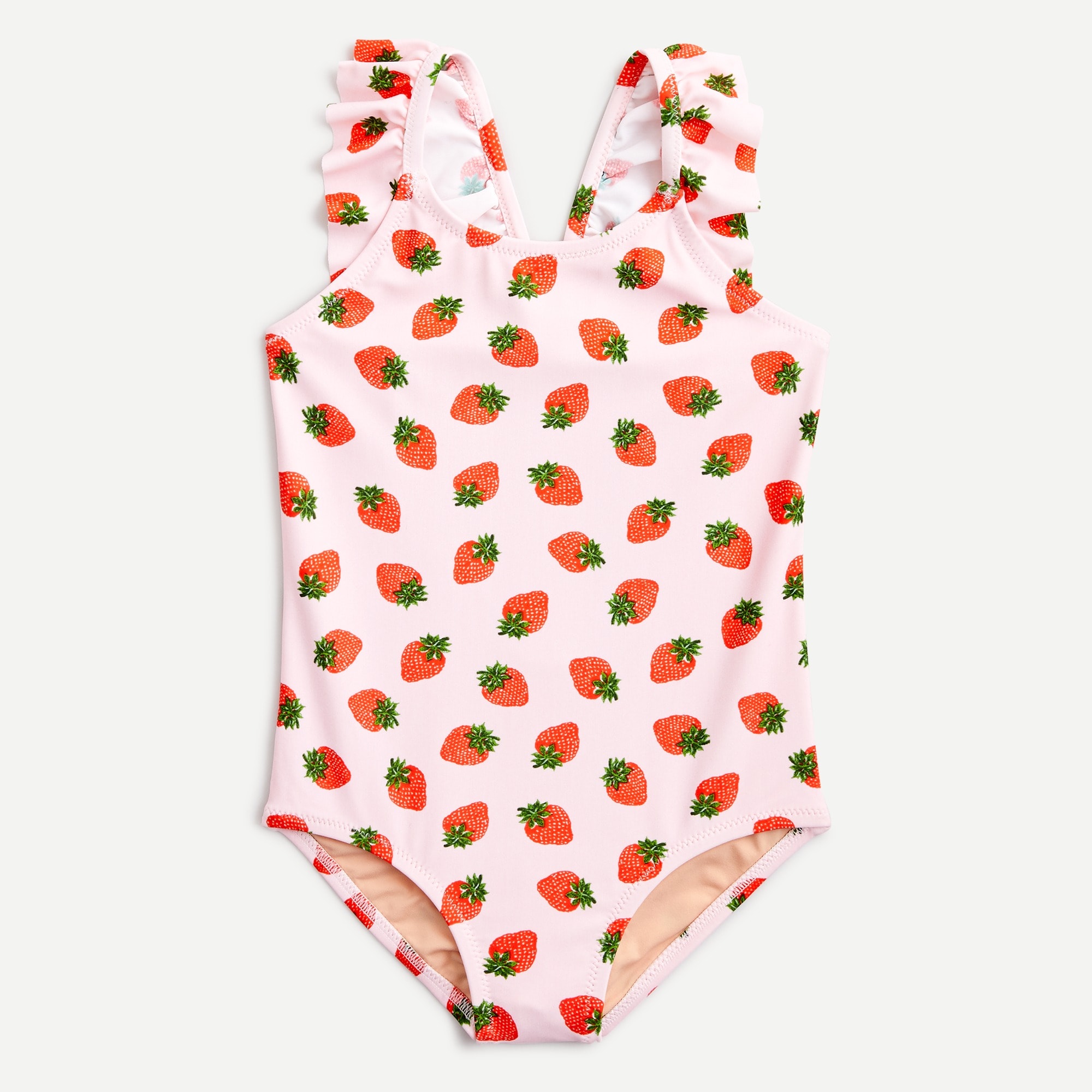 Like chinjao strawberry s elongated head is similar to fukuroukuju one of the seven gods of good fortune in japanese folklore who is often depicted with an abnormally high forehead. The pull on sleeveless swimsuit showcases an allover strawberry print that s sure to garner compliments at the pool and is adorned with a sweet ruffle trim at the top. Whether she s having fun in the sun or making a splash with family in the pool she ll be ready for adventures by the water in the strawberry one piece swimsuit from cat jack.