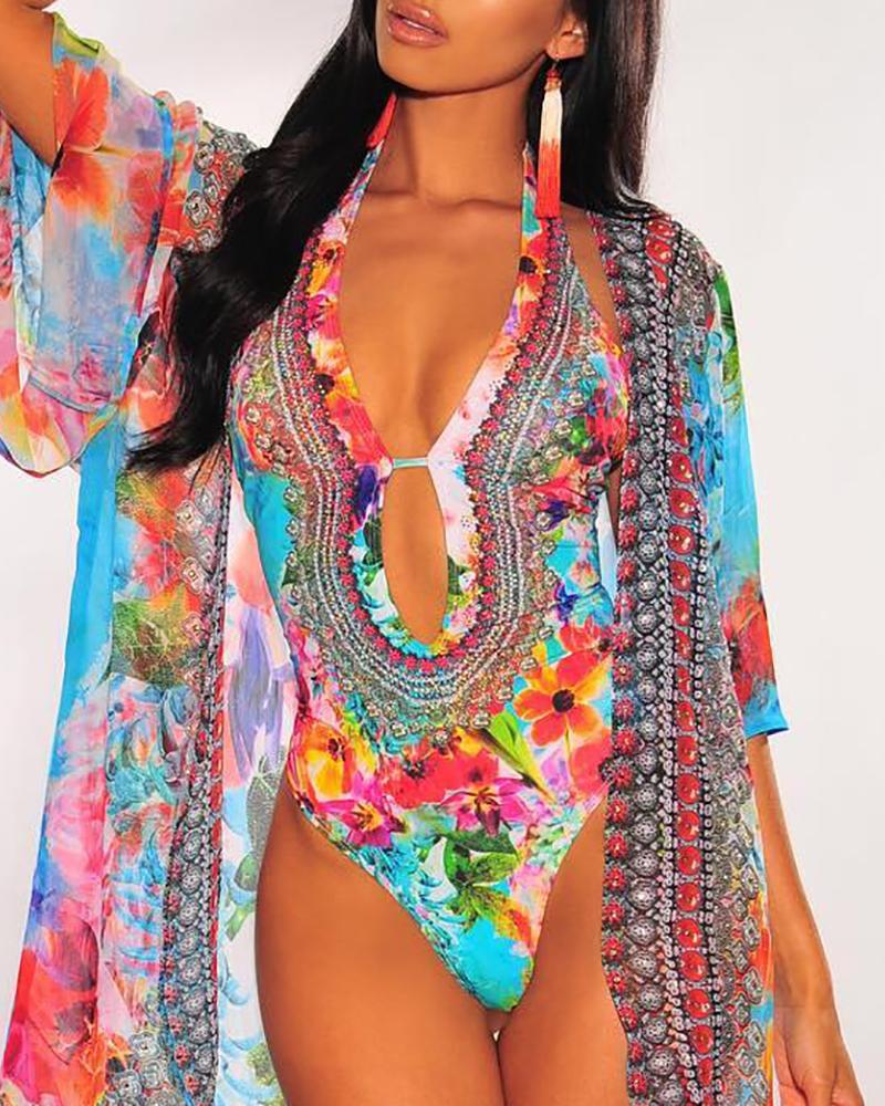 Floral Print One Piece Swimsuit With Cover Up