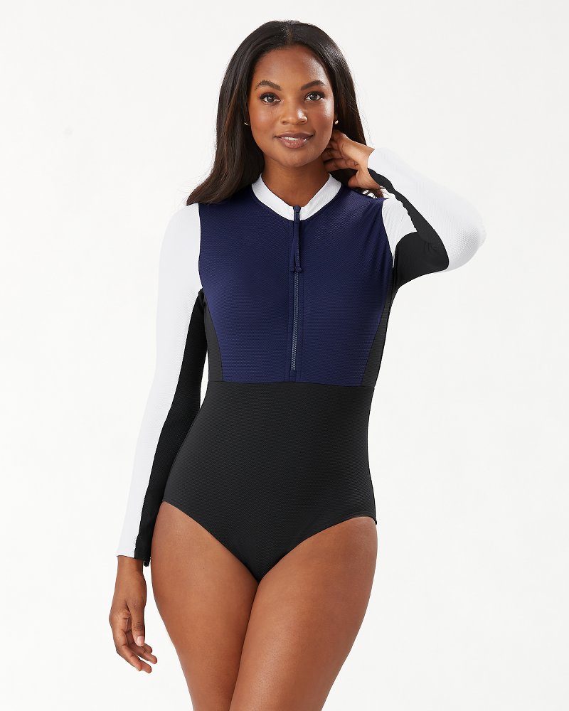 Protect your skin while having fun in the sun in our vast collection of long sleeve one piece swimsuits. Elevate your swimsuit collection with solids color block patterns and vibrant graphic prints. Whether you are paddleboarding scuba diving kayaking or snorkeling long sleeve swimsuits provide sun protection and comfort during water activities without compromising style.