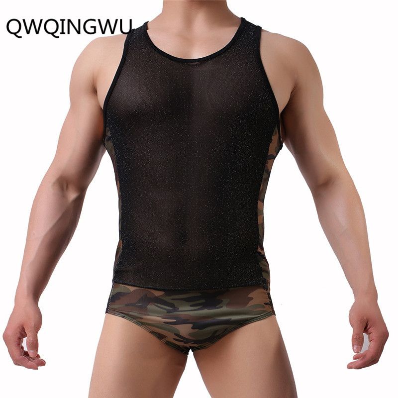 2020 Cool Men Camouflage Bodysuit Perspective Mesh Splicing Tank