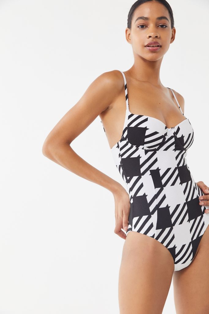 A sleek one piece crafted from form fitting ribbed knit this onia swimsuit features a bustier inspired bodice with hook and eye closures for an elegant poolside look. Underwire and cup padding with adjustable straps subtly lift and support your breasts. 4 3 out of 5 stars 20.