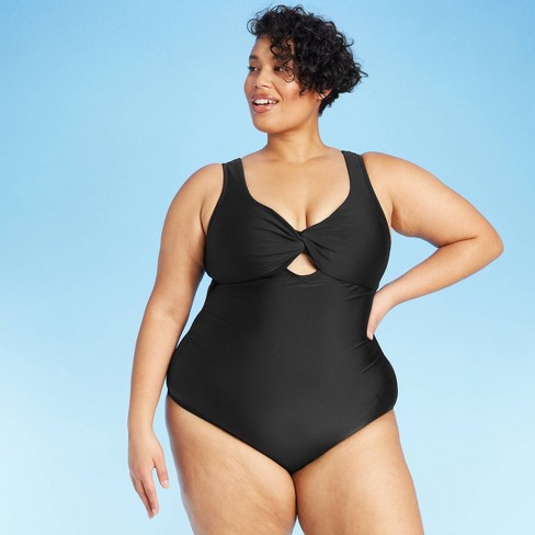 Plus size black one piece swimsuit. If you love bold shades choose a bright hued suit for something unique or use color to divide the top of the one piece from the bottom. Dark solid colors such as black and navy blue are figure slimming. With peek a boo cut outs laces and ties and deep vs these swimsuits aren t your mama s one pieces.