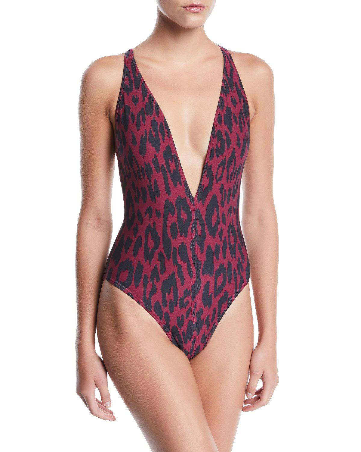 Red Leopard Print Deep V Neck One Piece Swimsuit In 2020 One
