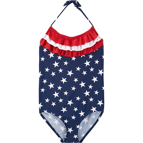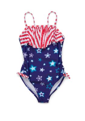 Get it as soon as tue jul 21. 3 8 out of 5 stars 17. This summer spirited one piece swimsuit features slimming vertical red and white stripes with embroidered blue stars for a patriotic feel.