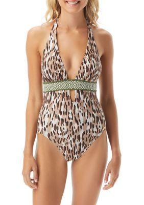 Deep plunge halter neckline open back whether you re on a tropical beach vacation or pool side relaxing under the sun the vince camuto swim collection is guaranteed to impress. Special price 74 99 regular price 122 00. Details bring effortless style to the resort beach or backyard pool in this sexy swimsuit.