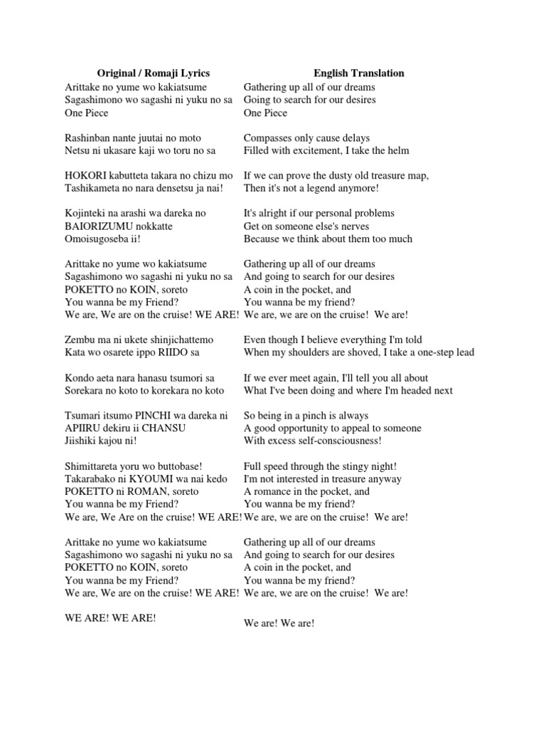 Anime Lyrics Japanese And English One Piece Opening 1 We
