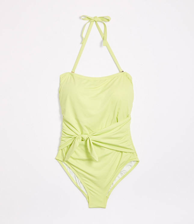 Women s bandeau one piece swimsuit with wrap detail. Strapless neckline with ruffle trim. Ralph lauren ombre palm flyaway one piece swimsuit.